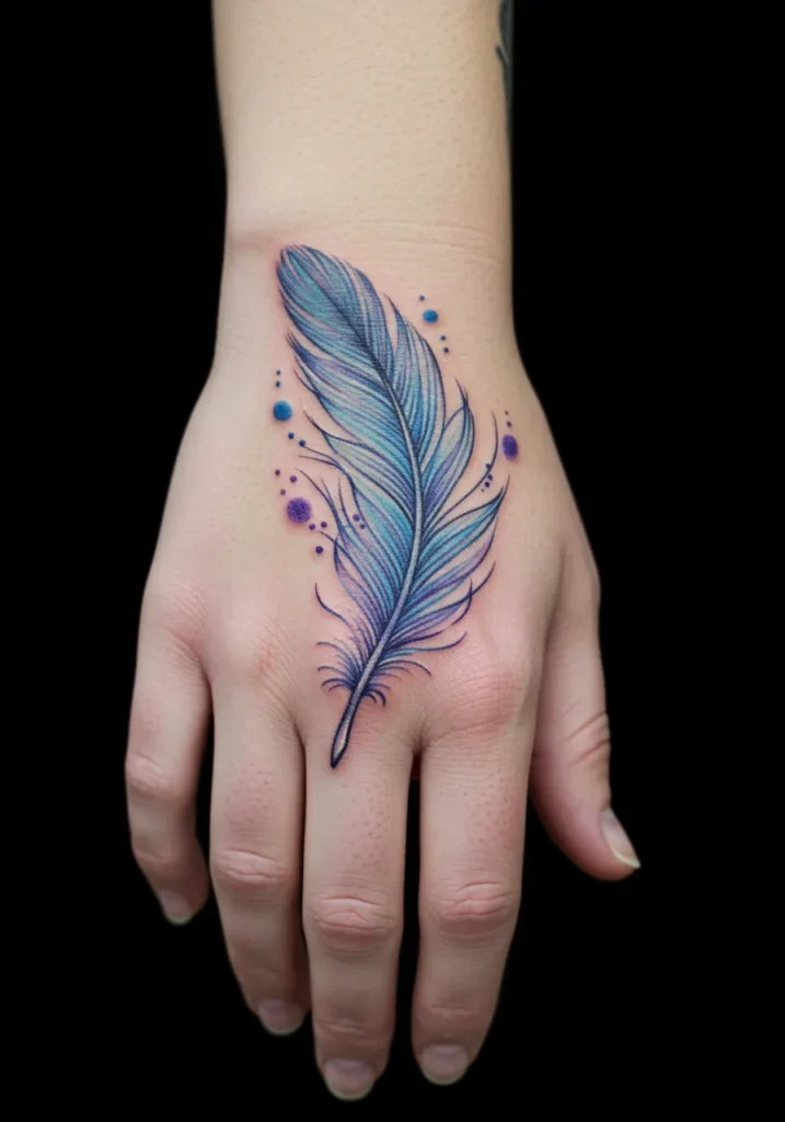 This stunning fine line hand tattoo features a graceful feather done in soft watercolor shades of blue, purple, and hints of teal. The feather floats effortlessly across the hand, with delicate lines and tiny ink splashes that almost feel like little drops of magic. The way the colors blend together gives it a dreamy, ethereal vibe while still keeping the fine detail crisp and clear.