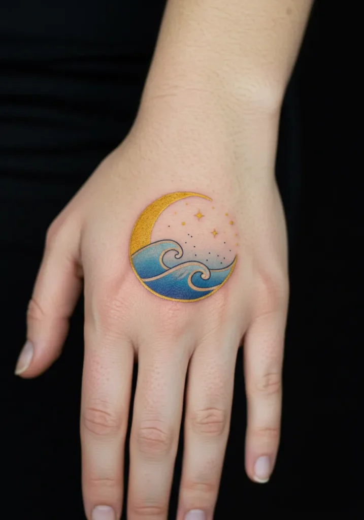 This beautiful hand tattoo showcases a golden crescent moon cradling soft blue waves, all wrapped inside a perfect circle. Tiny stars and delicate dots scatter across the sky, adding just the right amount of sparkle. The fine line details keep the design feeling light and airy, while the rich color palette of gold, blue, and soft pink gives it such a magical, dreamy vibe. The placement right on the back of the hand makes it feel like you re literally holding a little piece of the night sky.