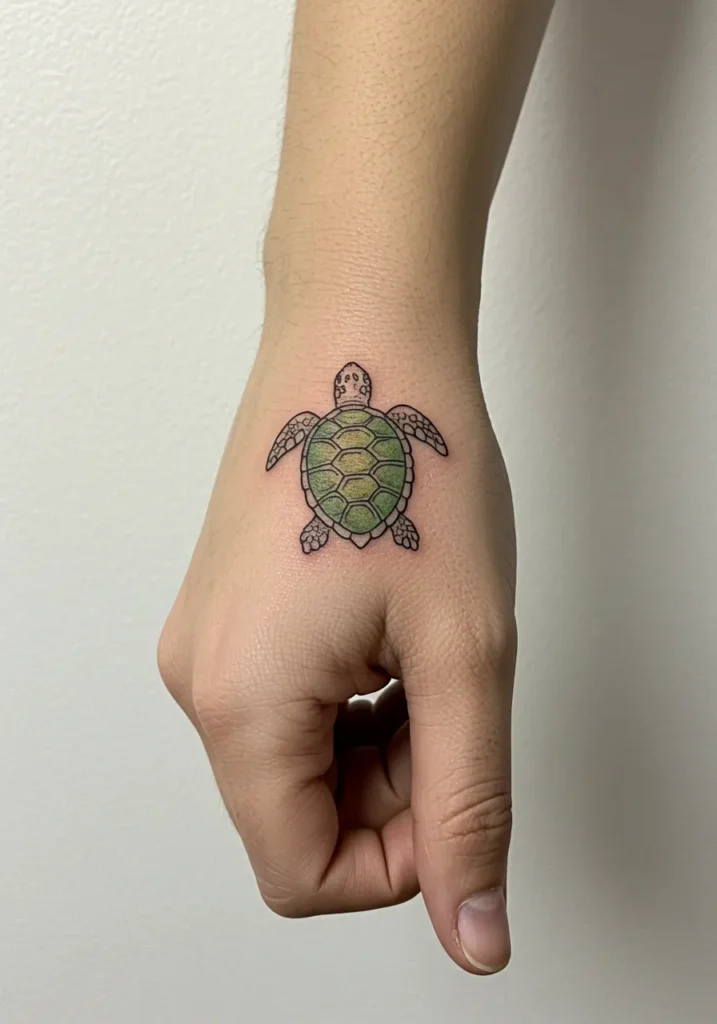 This lovely tattoo features a sweet little sea turtle, gracefully floating across the back of the hand. The fine black lines outline the shape of the turtle perfectly, while soft shades of green fill in its shell, giving it that unmistakable ocean vibe. The shell details are kept simple but still beautifully textured, making the design feel clean and balanced without losing any of its charm. The placement right on the hand makes this gentle creature feel like it s always close by.