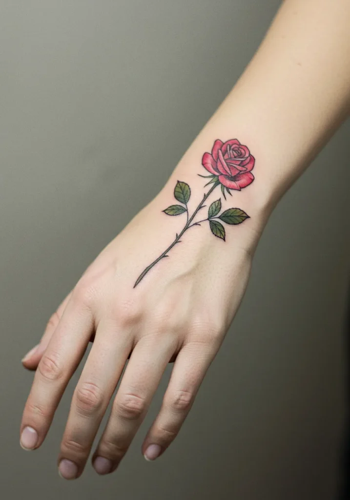 This tattoo features a single rose blooming beautifully right on the top of the hand. The stem is long, thin, and graceful, following the curve of the wrist and hand in a clean fine line style. The rose itself pops with soft red tones, and the leaves are shaded in a muted green, adding a gentle contrast. There s no clutter, no background noise, and definitely no extra ink just one elegant flower taking center stage.