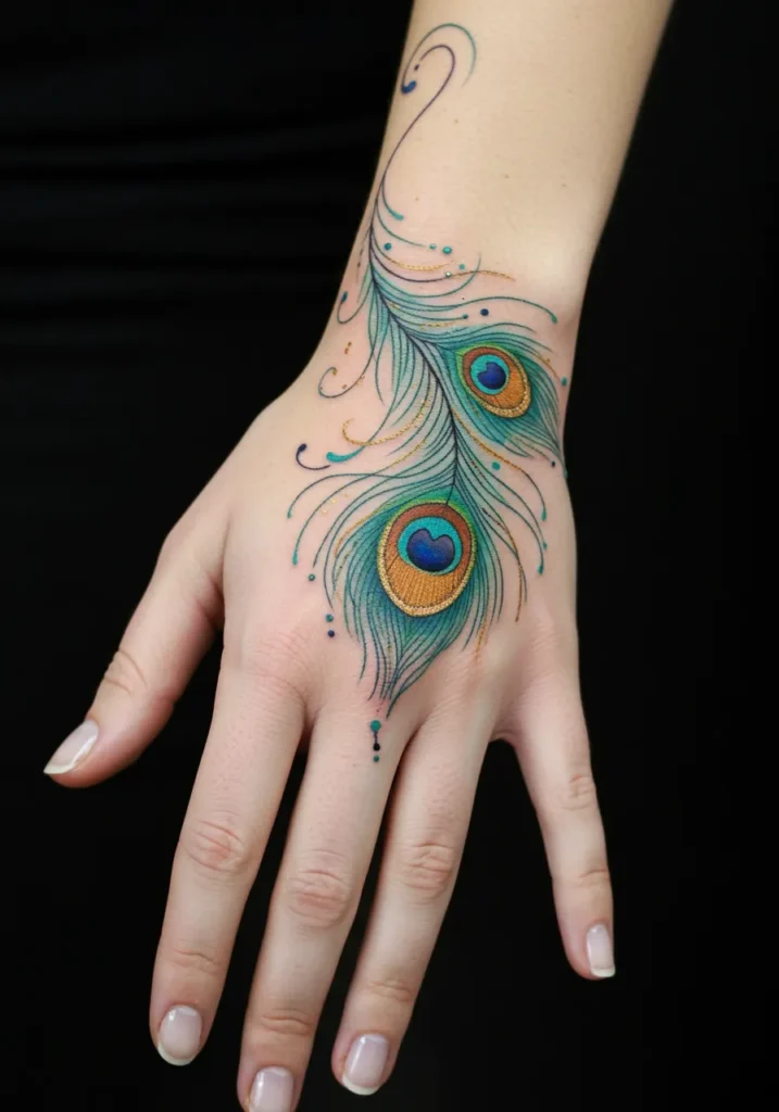 This gorgeous tattoo captures the elegance of a peacock feather with the softest fine line detailing. Flowing beautifully across the hand, the design features two intricate feather eyes in rich shades of teal, blue, and gold, each one highlighted with delicate swirl accents and tiny dotted elements. The feather curves gracefully from the wrist down to the fingers, giving it a natural, organic look that feels light as air.