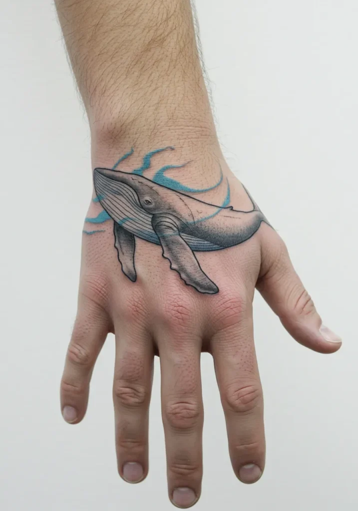 I really love how this tattoo feels both powerful and calming at the same time. Whales symbolize strength, freedom, and deep emotional wisdom, and this piece totally captures that energy without being too loud. It has such a soft, graceful flow, but still makes a bold statement exactly the kind of balance I look for in a beautiful hand tattoo.