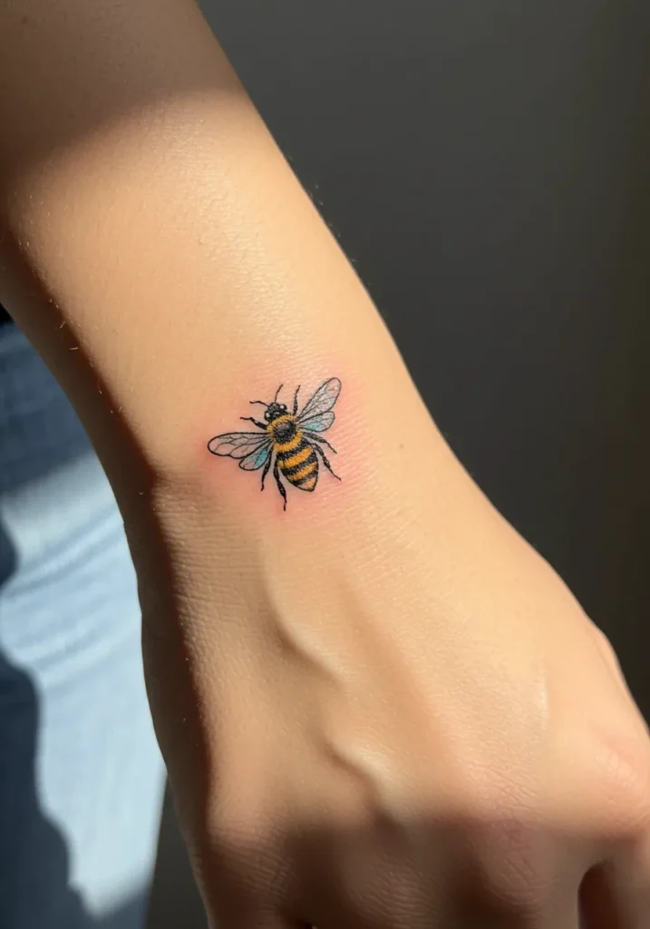 This adorable little bee tattoo sits perfectly on the side of the hand, showing off its soft black and yellow stripes with just a hint of blue on the delicate wings. The fine line detailing keeps the design feeling light and elegant, while the tiny size makes it feel like a sweet little secret tucked right into your skin. The color work is subtle but bright enough to give the bee its cheerful and unmistakable personality.