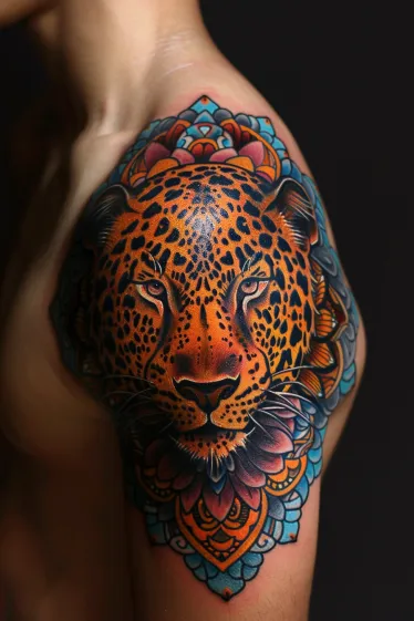This striking shoulder tattoo combines the fierce beauty of a leopard with intricate mandala-inspired patterns. The leopard s piercing gaze is enhanced by deep shading and bold outlines, making its golden fur stand out against the colorful geometric background. Rich blues, purples, and oranges form a mandala-like frame around the leopard s head, adding an artistic and almost spiritual touch. The placement on the shoulder allows the design to flow naturally, creating a powerful yet elegant statement.