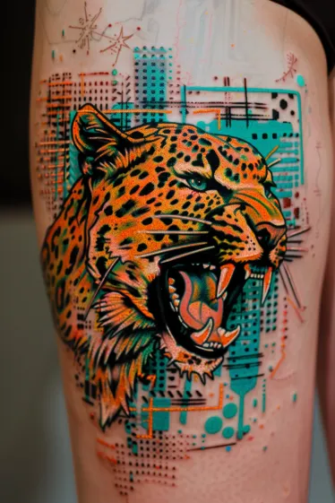 I can t get over how powerful this tattoo looks. The mix of classic leopard fierceness with a contemporary color palette makes it unforgettable. The way the artist blended traditional bold lines with futuristic patterns gives it such a cool, artistic edge. If you re into tattoos that scream confidence and energy, this one is pure perfection. Plus, who wouldn t want a fierce leopard protecting their leg?