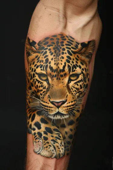 This tattoo captures every detail of a leopard s face with jaw-dropping realism. The piercing golden eyes, perfectly shaded fur, and lifelike spots make it feel as if the leopard is stepping right off the skin. The depth in the shading adds an almost three-dimensional effect, making the leopard s gaze even more intense. With its outstretched paw creeping forward, this design creates an illusion of movement, making it look even more dynamic.