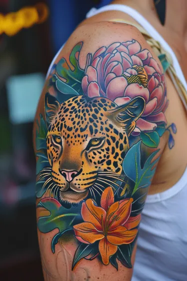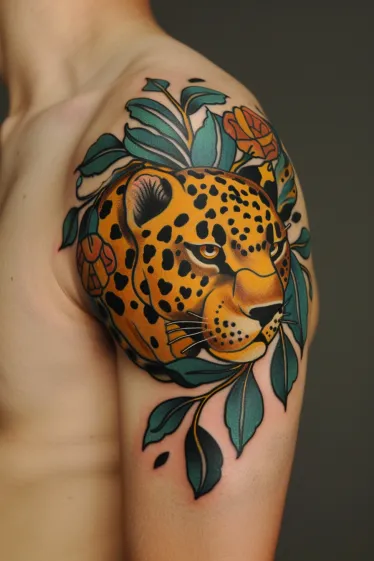 This bold shoulder tattoo features a striking neo-traditional leopard design, surrounded by lush botanical elements. The golden fur is perfectly contrasted by deep black outlines, giving the leopard a strong and defined presence. The surrounding teal leaves and orange roses create a beautiful color palette, adding depth and balance to the piece. With its clean shading and bold lines, this tattoo embodies the timeless appeal of neo-traditional artistry while keeping the leopard s gaze fierce and captivating.