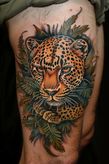 This striking thigh tattoo blends neo-traditional artistry with nature-inspired beauty. The leopard s gaze is intense, with golden eyes that seem to glow against its perfectly detailed fur. Each spot and whisker is shaded to perfection, giving the design a lifelike presence. Surrounding the leopard are rich green fern leaves, adding a lush jungle feel that enhances the overall depth. The bold outlines and vibrant color palette make this piece pop while maintaining an elegant, balanced look.