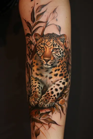 This tattoo is absolutely mesmerizing. The way the leopard s face is framed by the foliage makes it feel like a powerful guardian of the wild. The deep, saturated colors add so much warmth and energy, making it impossible to ignore. I love how this piece feels both fierce and sophisticated, proving that bold tattoos can still have a soft, artistic flow. If you want something that turns heads while staying timeless, this is a dream design.