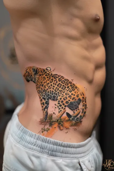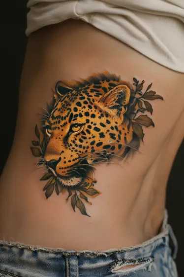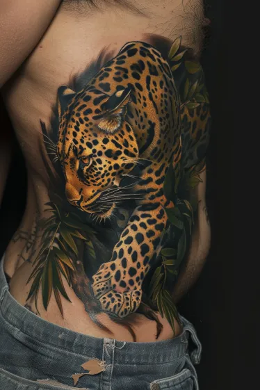 This breathtaking rib tattoo captures a leopard in mid-motion, prowling forward with striking intensity. The hyper-realistic shading brings out every detail, from the golden fur and intricate rosettes to the deep, piercing eyes. The way the leaves frame the leopard makes it look like it s emerging straight from the jungle, blending beautifully with the curves of the body. The depth and dimension in this piece make it feel alive, like the leopard could leap forward at any moment.