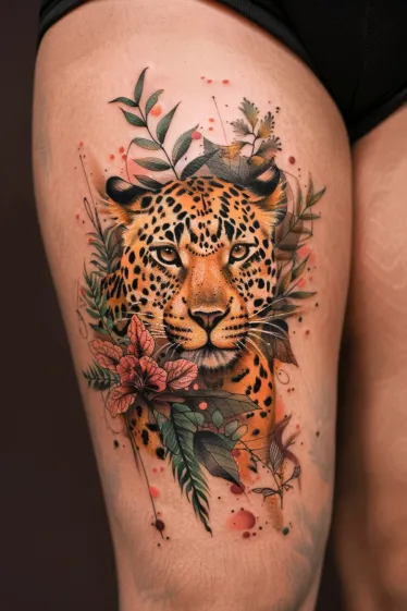 This stunning thigh tattoo blends the fierce beauty of a leopard with delicate floral artistry. The lifelike fur detailing and deep golden eyes create an intense, mesmerizing gaze, while soft leaves and blooming flowers weave around the design, adding a touch of elegance. Subtle watercolor splashes in warm red and green hues give the piece a dreamy, artistic finish. The placement on the thigh makes this tattoo both bold and effortlessly feminine, creating a perfect balance between strength and grace.