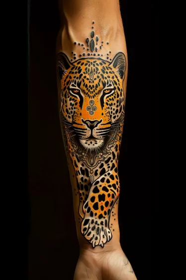 This striking forearm tattoo blends the fierce elegance of a leopard with intricate ornamental detailing. The leopard s gaze is intense, with deep golden tones that contrast beautifully against the bold blackwork. Delicate decorative patterns frame the face, adding a regal and almost mystical touch. The extended paw reaching downward enhances the natural flow of the arm, making this piece look effortlessly balanced and refined. The symmetrical placement of dotwork and ornamental accents gives it a stunningly artistic vibe.