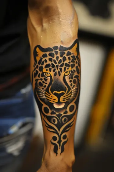 This bold forearm tattoo blends tribal design with a leopard s fierce gaze, creating a striking balance between modern artistry and ancient symbolism. The black inkwork forms sharp geometric patterns, while the warm golden highlights bring the leopard s face to life. Positioned on the inner forearm, the design naturally flows with the arm s structure, giving it a powerful and symmetrical look. The contrast between solid black shading and open space detailing makes this tattoo stand out without feeling overwhelming.