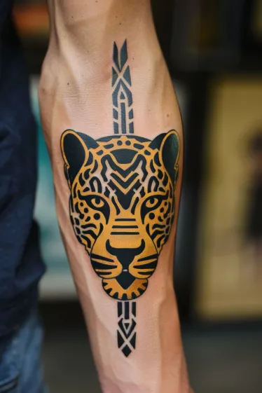 This bold forearm tattoo transforms the fierce elegance of a leopard into a striking geometric design. The sharp black lines and symmetrical patterns give the face a modern, almost tribal aesthetic, while the golden tones add warmth and depth. A vertical line of intricate shapes runs through the center, extending beyond the leopard s head to create a balanced and cohesive look. The clean edges and high contrast make this piece both eye-catching and timeless.