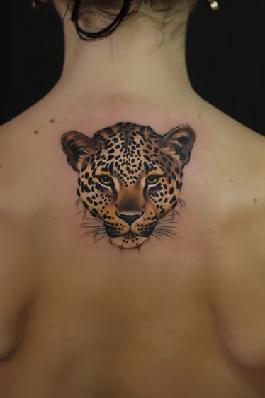 This elegant back tattoo features a beautifully detailed leopard face with a soft, realistic touch. The design focuses on precision, highlighting the intricate fur patterns, deep amber eyes, and subtle shading. Positioned perfectly in the center of the upper back, the placement draws attention to the natural curves of the shoulders, making the design both striking and graceful. Without additional elements, the simplicity of the tattoo lets the fierce yet calm expression of the leopard take center stage.