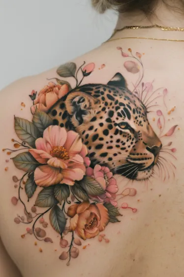 This breathtaking shoulder tattoo blends the fierce elegance of a leopard with soft, romantic floral details. The leopard s gaze is intense yet calm, with intricate fur shading that adds incredible depth. Surrounding it are delicate peach and blush-toned roses, along with fine botanical elements that create a graceful, flowing composition. Subtle watercolor splashes give the design a dreamy, artistic touch, making it feel both wild and feminine. The placement on the shoulder enhances the natural curves of the body, giving the tattoo a beautiful, organic flow.