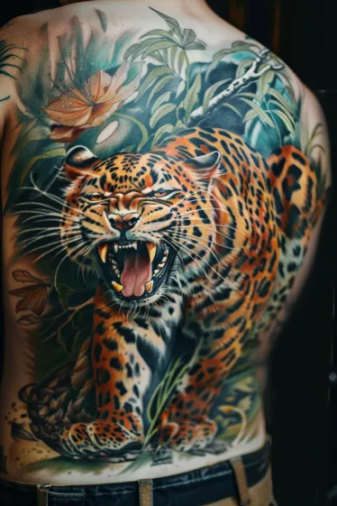 This jaw-dropping full-back tattoo captures the raw intensity of a leopard in full motion. The bold orange and black coat is shaded to perfection, giving the fur a hyper-realistic texture. With its mouth wide open, sharp teeth bared, and powerful muscles flexed, this leopard looks ready to pounce. The lush jungle background, with deep green leaves and vibrant flowers, creates the perfect setting, adding movement and depth to the piece. Every inch of this tattoo is packed with energy, making it a true work of art.