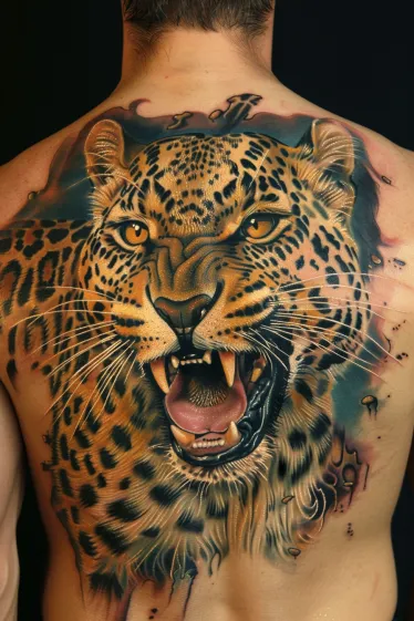 This powerful full-back tattoo brings the wild energy of a roaring leopard to life. The hyper-realistic details in the fur, whiskers, and piercing golden eyes make this design impossible to ignore. With its mouth open wide, revealing sharp teeth and a deep snarl, the expression captures raw intensity. Subtle blue and smoky shading in the background adds dimension, making the leopard appear as if it s emerging from the skin. Every part of this tattoo exudes strength, making it a bold statement piece.
