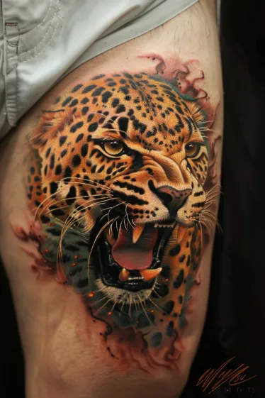 This stunning thigh tattoo captures the raw power of a roaring leopard in breathtaking detail. Every fur strand, every whisker, and every shadow is meticulously shaded to create a hyper-realistic effect. The open mouth, showing off sharp teeth and deep red tones, adds an extra layer of intensity. A fiery, almost smoky effect surrounds the leopard s head, making it look like it s bursting through the skin. The placement on the thigh enhances the impact, giving this fierce design a bold and commanding presence.