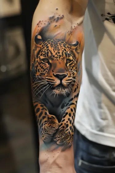 This jaw-dropping forearm tattoo features a hyper-realistic leopard creeping forward, its gaze piercing and intense. Every tiny detail in the fur, whiskers, and eyes makes this design feel alive and untamed. The background has abstract watercolor splashes, blending seamlessly into the skin, giving the illusion that the leopard is emerging from the artwork itself. The placement on the forearm allows the natural movement of the body to enhance the depth and lifelike quality of the tattoo.