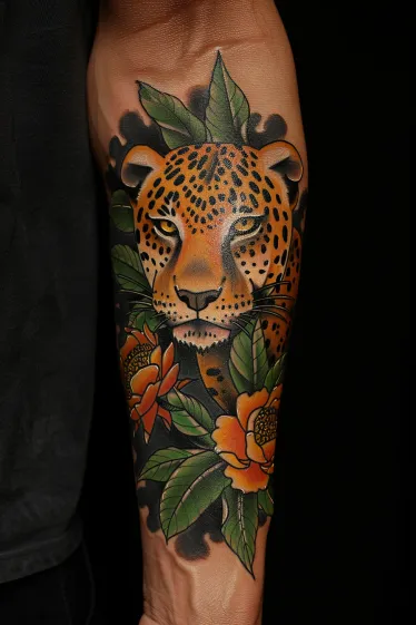 Neo-Traditional Leopard and Floral Forearm Tattoo