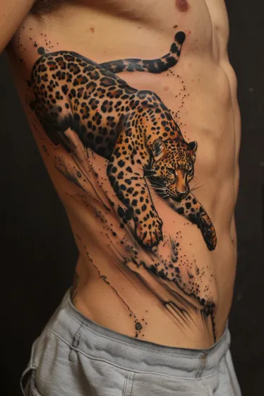 This bold rib tattoo captures the raw power and grace of a leaping leopard in stunning detail. The shading and texture bring the fur to life, making each spot and muscle appear incredibly realistic. The motion effect, created by artistic ink splashes and streaks, adds an extra layer of energy, making it look like the leopard is diving straight off the skin. The long, flowing design perfectly follows the body s natural curves, making this piece both striking and beautifully placed.