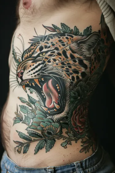 This bold rib tattoo brings the fierce energy of a roaring leopard to life in stunning neo-traditional style. Thick, clean outlines and rich, earthy tones give the design a timeless look while maintaining incredible detail. The leopard s open mouth, with razor-sharp teeth and a deep red tongue, adds a sense of raw power. Surrounding it are lush leaves and soft floral elements, balancing the intensity with an organic, artistic touch. The placement along the ribcage makes this design flow beautifully with the body s natural curves.