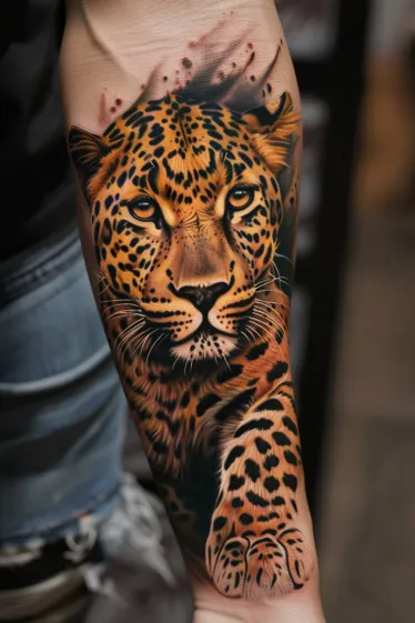 This jaw-dropping forearm tattoo captures the beauty and intensity of a leopard in stunning detail. The golden fur is shaded to perfection, with every spot and whisker bringing the design to life. The eyes have a deep, almost hypnotic gaze, making it feel like the leopard is staring straight into your soul. The extended paw adds a sense of movement, as if this fierce creature is stepping forward. A subtle splash effect in the background blends into the skin, giving the piece a modern, artistic touch.