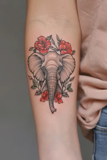 This elegant forearm tattoo features a delicately shaded elephant head, framed by vibrant red poppies and soft green leaves. The fine line detailing gives the elephant a graceful, minimalist feel, while the poppies add a striking pop of color, symbolizing remembrance, resilience, and beauty. The compact design sits perfectly on the forearm, making it a balanced and eye-catching piece.