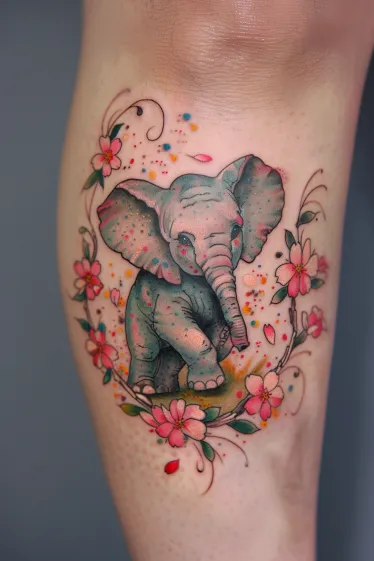 I can t get over how playful and heartwarming this design is. The baby elephant s joyful energy, combined with the soft florals and watercolor accents, makes it feel both lively and gentle. I love how the colors make the whole piece pop, without overwhelming the design. If you re into cute, meaningful tattoos with a fun and artistic twist, this one is absolutely perfect.