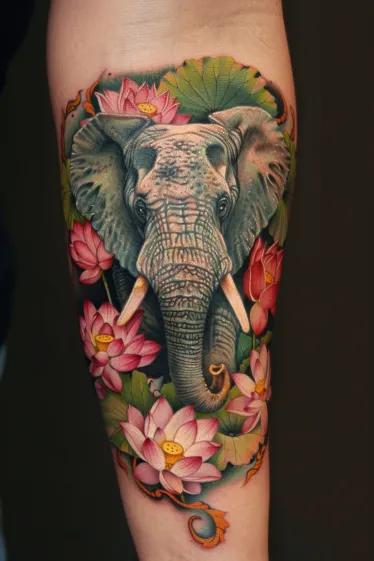This stunning forearm tattoo features an incredibly detailed elephant, its wise eyes gazing forward with a quiet strength. Surrounding it are vibrant pink lotus flowers, their petals unfolding with a delicate touch of realism. The lush green leaves add contrast, making the whole design feel rich and full of life. The shading on the elephant s skin is expertly done, capturing the depth and texture of its wrinkled hide, while the bold outlines and soft color gradients make the flowers pop.