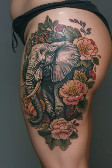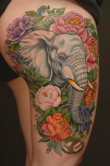 This breathtaking thigh tattoo features a graceful elephant, framed by a lush arrangement of vibrant peonies in shades of pink, purple, and orange. The soft shading on the elephant s skin gives it a lifelike depth, while the bold floral colors add a stunning contrast. The delicate green leaves weave through the design, making the entire piece feel flowing and organic. Positioned on the thigh, this tattoo is both bold and beautifully feminine, making it a true statement piece.