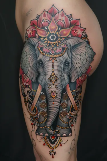 This tattoo is a true masterpiece featuring a majestic elephant head, beautifully adorned with intricate mandala patterns and a vibrant red lotus flower blooming from its crown. The bold black outlines and rich shading create depth, while the warm gold and deep crimson hues add a striking contrast. Elegant ornamental details frame the design, giving it an almost royal, henna-inspired aesthetic. Placed on the thigh, this tattoo not only commands attention but also flows seamlessly with the body s natural curves.