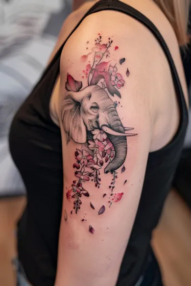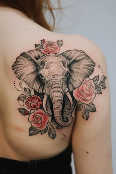 This stunning shoulder tattoo features a realistic elephant head, beautifully framed by softly shaded roses in warm pink tones. The fine line detailing on the elephant s skin adds a lifelike depth, while the delicate floral accents and subtle ornamental swirls create a graceful, feminine touch. The placement on the shoulder allows the design to flow naturally with the body, making it a bold yet elegant statement piece.