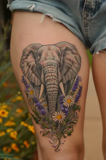 This elegant thigh tattoo features a realistic elephant head, framed by a delicate arrangement of lavender, daisies, and flowing greenery. The soft shading on the elephant gives it a natural, almost ethereal feel, while the gentle purples, whites, and greens in the flowers add a beautifully feminine touch. The placement on the thigh allows for a flowing composition, making it both eye-catching and gracefully balanced.