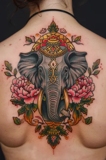 This incredibly detailed back tattoo features a majestic elephant head, adorned with intricate golden ornaments and framed by lush pink peonies. The bold black shading on the elephant adds depth and realism, while the delicate floral accents soften the design, creating a stunning balance of strength and elegance. The golden mandala-like patterns on the elephant s forehead and trunk bring in a sacred, almost regal energy, making the entire piece feel like a symbol of wisdom and beauty.
