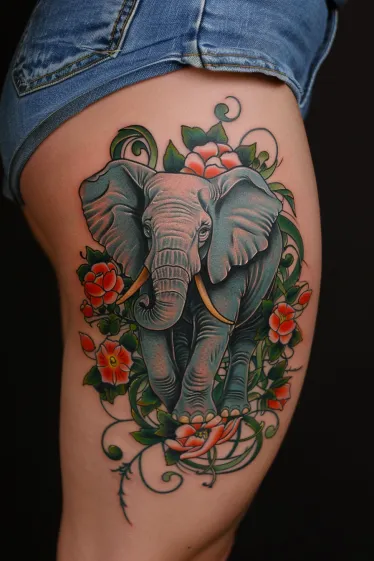 This striking thigh tattoo features a powerful elephant surrounded by vibrant orange flowers and lush green vines. The elephant s realistic shading makes it stand out, while the bold floral details add depth and movement to the design. The intricate swirls of vines give it a flowing, organic feel, making it a perfect fit for the curves of the thigh. The deep green tones contrast beautifully with the warm orange petals, creating a tattoo that feels bold yet elegant.