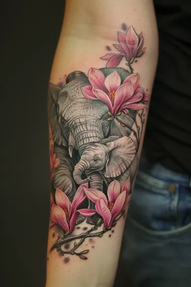 Mother and Baby Elephant With Magnolia Forearm Tattoo