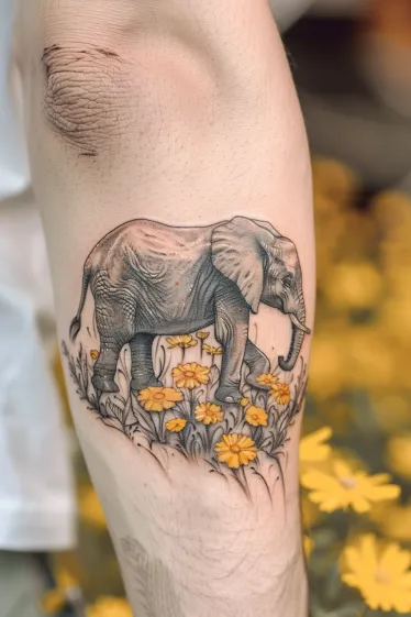 This beautifully subtle tattoo captures a graceful elephant walking through a field of bright yellow wildflowers. The black and grey shading on the elephant adds a touch of realism, while the delicate floral accents provide a soft, artistic contrast. With its simple yet elegant composition, this design feels peaceful and timeless. The placement on the inner calf makes it an intimate and personal piece, perfect for those who love small but meaningful tattoos.