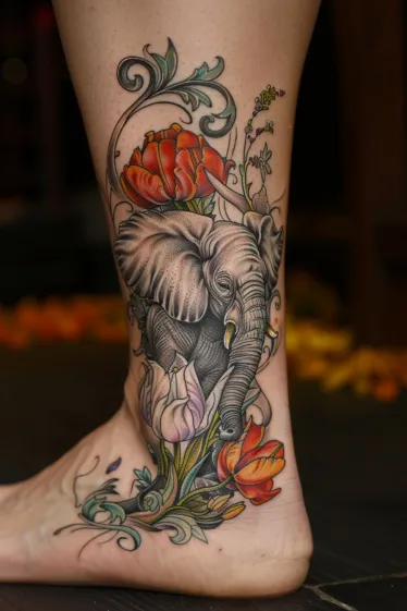 This breathtaking ankle tattoo features a graceful elephant, surrounded by an elegant swirl of tulips and decorative vines. The realistic shading on the elephant brings it to life, while the bold orange and soft pink tulips create a stunning contrast against the detailed black and grey tones. Flowing vines and delicate flourishes frame the design beautifully, making it feel both organic and artistic. The placement on the ankle and foot gives this tattoo a natural, flowing movement, as if the design is wrapping around like a piece of jewelry.