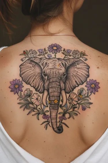 Floral Elephant Back Tattoo With Soft Purple Accents