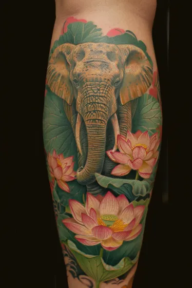 Majestic Elephant and Lotus Flower Leg Tattoo