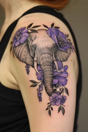This gorgeous shoulder tattoo features a realistic elephant head, delicately framed by vibrant purple flowers. The black and grey shading on the elephant adds a soft, lifelike texture, while the deep violet blooms create a striking contrast. The way the floral elements weave around the ears and trunk gives the design a balanced, natural flow, making it look like a living piece of art.