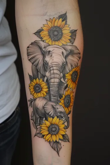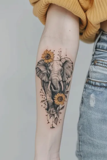 This elegant forearm tattoo features a realistic elephant paired with bright yellow sunflowers and subtle botanical details. The fine-line shading brings out the elephant s wise and gentle expression, while the sunflowers add warmth and vibrancy. Tiny dotwork elements give the design a light, airy feel, making it perfect for those who love subtle yet meaningful tattoos. The forearm placement enhances the vertical flow, allowing the details to shine beautifully.