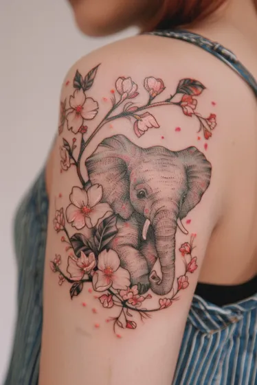 Delicate Elephant and Cherry Blossom Shoulder Tattoo