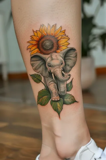 This adorable ankle tattoo features a cheerful baby elephant, playfully reaching forward with its trunk, surrounded by lush green leaves and a bright sunflower. The realistic shading on the elephant makes it look soft and full of life, while the bold colors of the sunflower add a warm, sunny vibe. Placed on the ankle, this design feels lighthearted and uplifting, making it a perfect balance of fun and elegance.