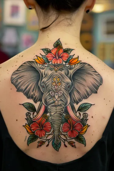 This stunning upper back tattoo features a majestic elephant head, intricately decorated with ornamental patterns and framed by bold hibiscus flowers in shades of red and orange. The rich black shading gives the elephant a strong, lifelike presence, while the bright floral accents create a beautiful contrast. The ornamental details on the forehead and trunk add an elegant, almost regal touch, making the design feel both powerful and feminine.