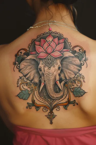 This stunning back tattoo features an intricately detailed elephant adorned with a majestic pink lotus flower blooming from its head. The decorative filigree patterns surrounding the elephant give the piece an ornamental, almost royal appearance. Soft shading and subtle color gradients add depth, making the tattoo feel both elegant and powerful. The placement on the upper back enhances the symmetry, making this design truly eye-catching.