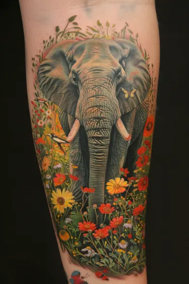 I m obsessed with how magical this looks. The combination of bold realism and soft floral elements makes it feel both powerful and delicate. Something about the way the elephant blends into the meadow gives it a peaceful, almost storytelling quality, like it s stepping right out of a painting. If you love tattoos that feel alive, this one is an absolute masterpiece.