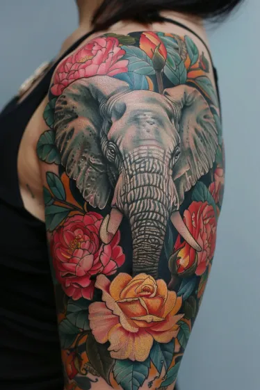I can t get over how bold and elegant this tattoo feels. The elephant s wisdom and strength, combined with the romantic and vibrant flowers, create a piece that feels both fierce and feminine. The warm tones of the roses and peonies add a timeless beauty, making this an absolute masterpiece for anyone who loves detailed, nature-inspired tattoos. If you re into statement designs that blend power and grace, this one is absolutely unforgettable.